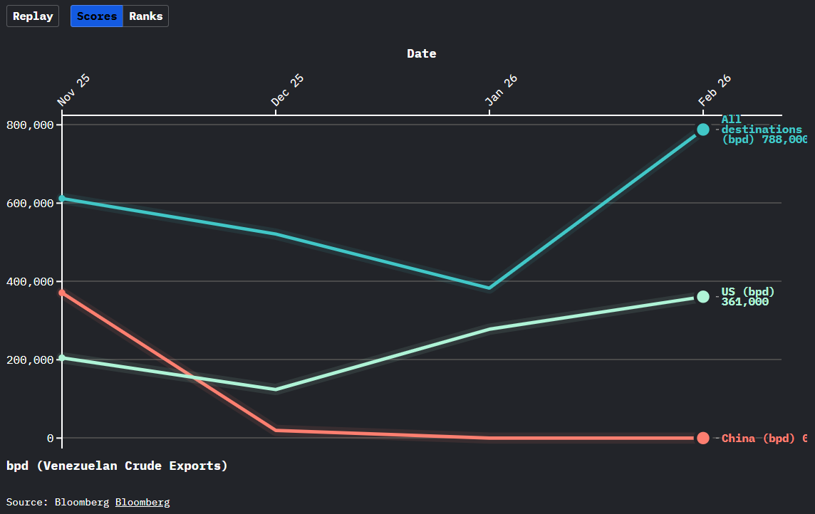 - [WATCH] [2.3.26]: Bloomberg data (via RWA Times substack, 2 Mar) shows total Venezuelan crude exports actually doubled in February from their January low — but this uptick reflects US-controlled flows to the US, Europe, and Caribbean, not China. The structural shift is now confirmed: Venezuela's oil has gone from a China-first system (buying 75% of exports in 2025) to a US-first system (US and Caribbean buyers now dominating). For Chinese teapot refiners with equipment specifically designed for Venezuelan heavy sour crude, this is a permanent supply shock until an alternative (Canadian heavy grades, Iraq's Basra Heavy) can be commercially substituted. Source: [RWA Times / Bloomberg data] T2, BSP, T3, BW