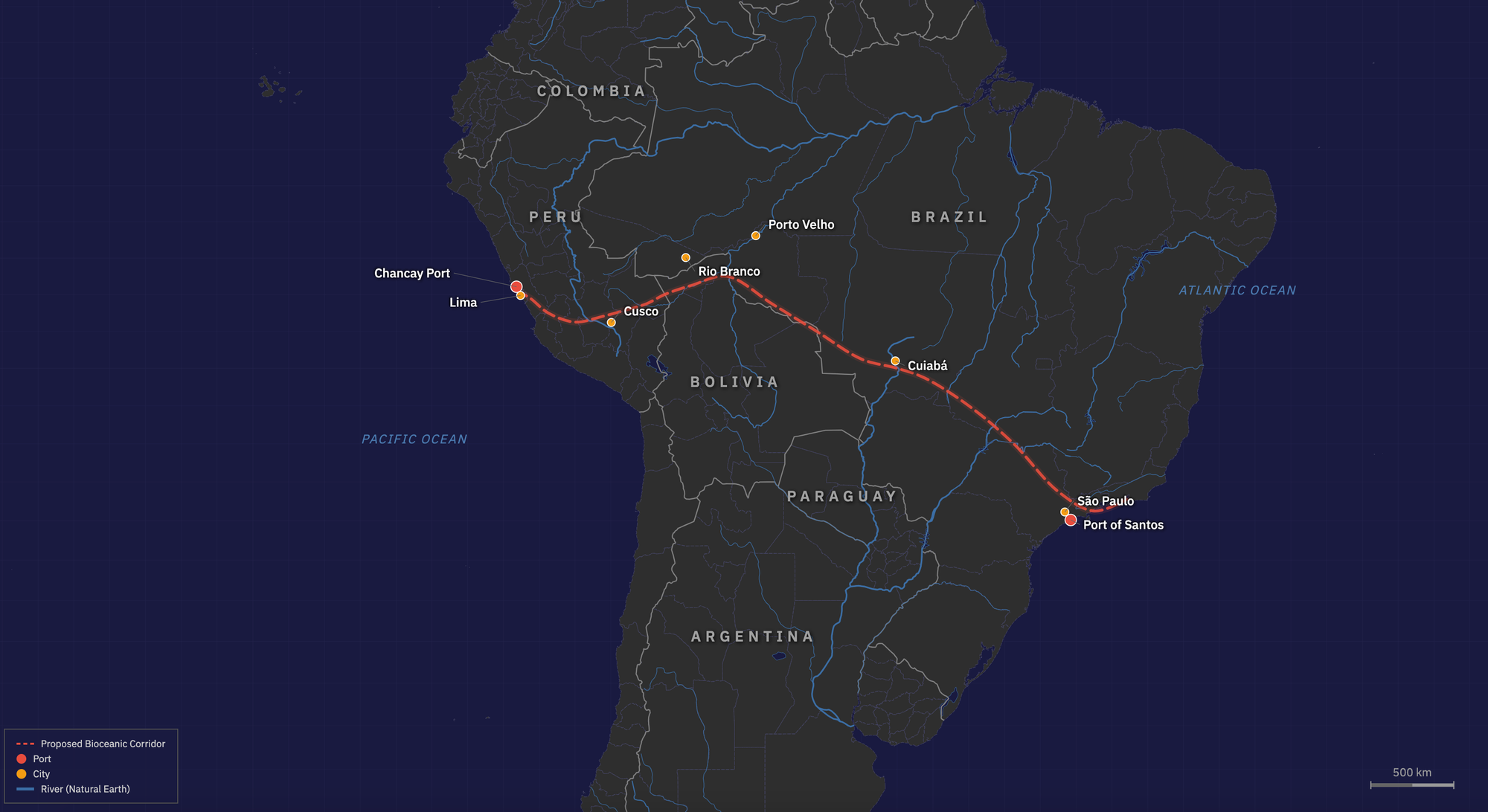 - [WATCH] [1.04.26] Experts have warned that a planned rail route between Peru and Brazil, known as the ‘Bioceanic Railway,’ will bring unacceptable “risk” to the Amazon rainforest. The planning process for a massive, Chinese-sponsored, rail system linking the Pacific and Atlantic oceans across the continent is accelerating. In 2025, memorandums of understanding were signed between Brazil, Peru and China. In 2026, Peru signed a deal with Chinese SOE, Power Construction Corporation of China, to construct a section of the line connecting the Pacific Port of Chancay to the mining region of the Sierra Central. Source: [Mongabay].